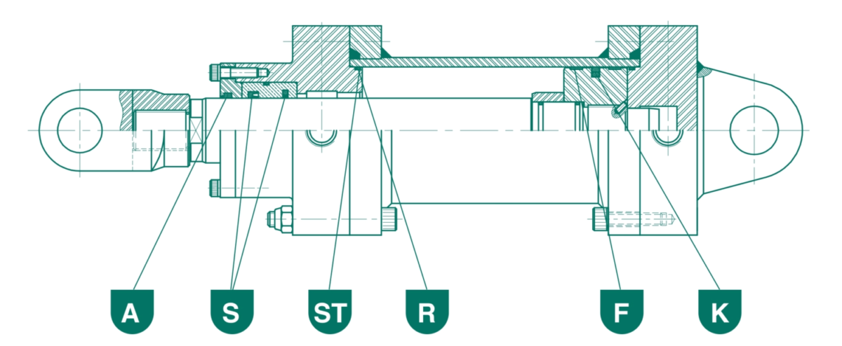 A vedação externa está localizada na área do cilindro onde o pistão se move para frente e para trás. Seu principal objetivo é evitar vazamento do fluído hidráulico do lado pressurizado para o lado oposto (câmara oposta). Vedações de Pistão de dupla ação são projetadas simetricamente, pois são pressurizadas em ambos os lados e, em pressões operacionais mais elevadas, anéis de suporte adicionais são usados para evitar sua extrusão.